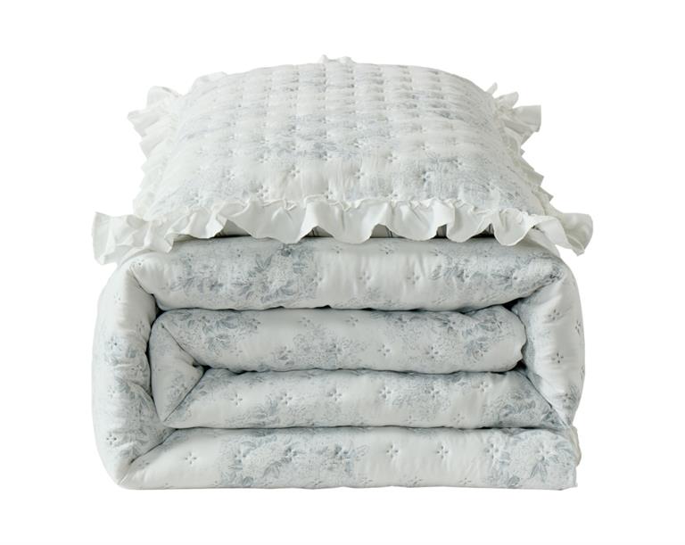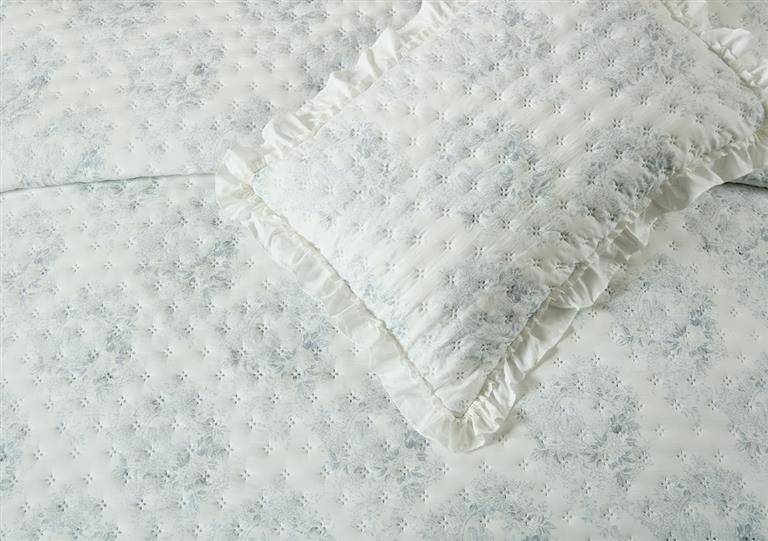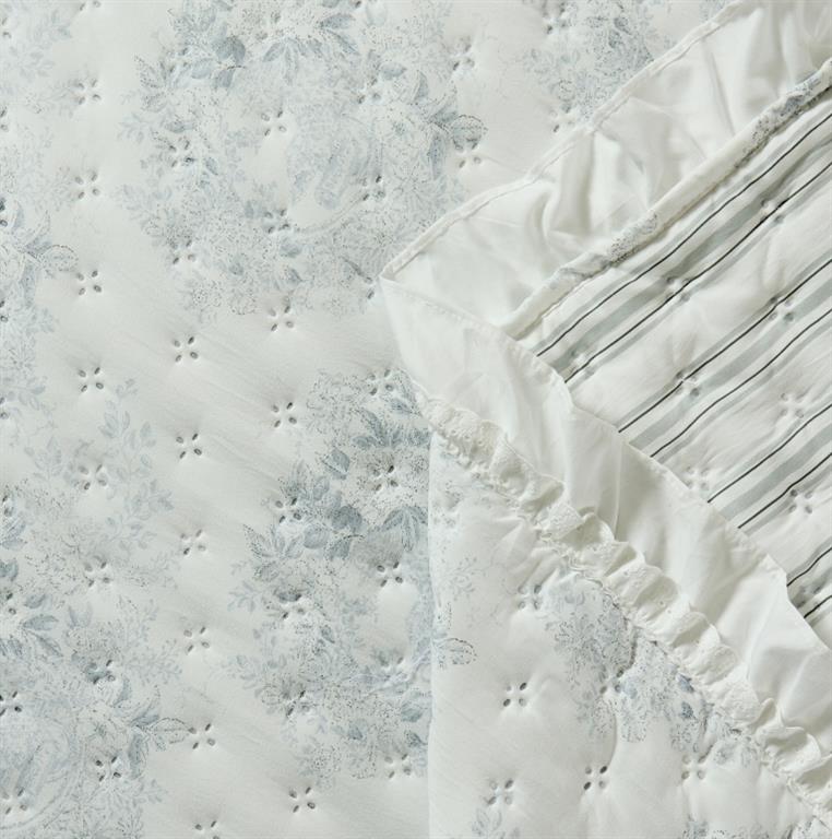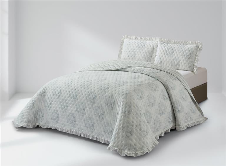Colcha termosellada con volantes en el acabado, de diseño elegante y confección resistente, ideal para aportar un toque decorativo y ordenado al dormitorio.