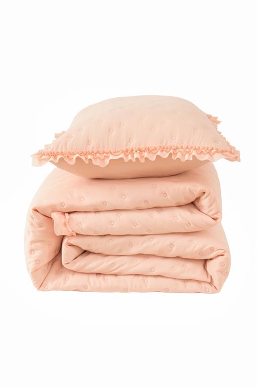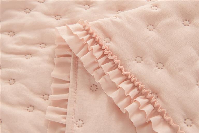 Colcha termosellada con volantes en el acabado, de diseño elegante y confección resistente, ideal para aportar un toque decorativo y ordenado al dormitorio.